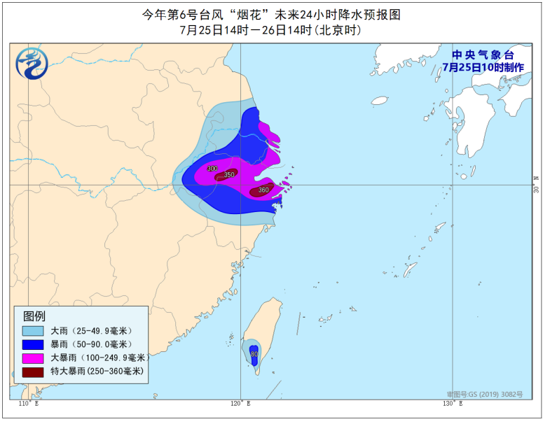 降水预报:25日14时至26日14时,浙江中北部、上海、江苏南部、安徽南部、台湾岛南部等地的部分地区有大雨或暴雨,其中,浙江北部、上海、江苏东南部、安徽东南部等地的部分地区有大暴雨,浙江北部、安徽东南部局地有特大暴雨(250~360毫米)。