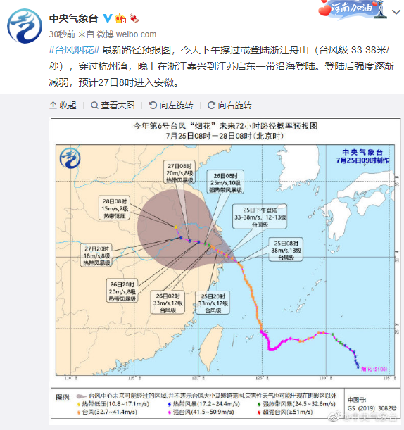预计,“烟花”将以每小时15公里左右的速度向西北方向移动,今天下午擦过或登陆浙江舟山,穿过杭州湾,今天晚上在浙江嘉兴到江苏启东一带沿海登陆(台风级,12-13级,33-35米/秒)。登陆后强度逐渐减弱,并将向偏西转偏北方向移动。