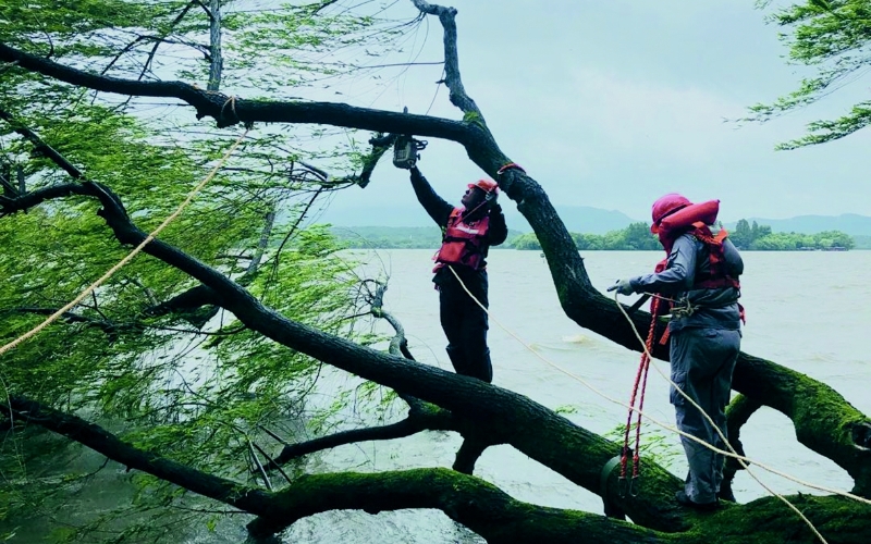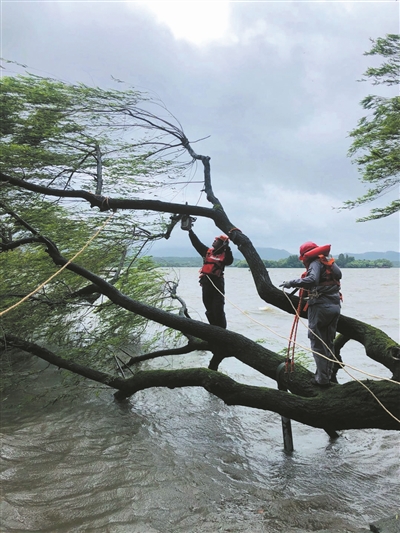 这株柳树高10多米,被风吹倒后,伏在水面上,石板也被粗大的树根撬开。考虑到行人和树木的安全,凤凰山管理处立即采取措施。园林抢救人员在腰上系上保险带,再绑上一道麻绳,做好双保险后,就开始了上杆作业。经过一系列紧急救援措施,目前树冠上的树枝已被清理,等待风雨过后再进行扶正处理。树根周围也已拉起警戒带,提醒行人绕行。