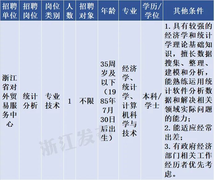 浙江省对外贸易服务中心为省商务厅下属公益二类事业单位,机构规格相当于正处级,预算形式为财政适当补助。本批次招聘需求为1个岗位1人。