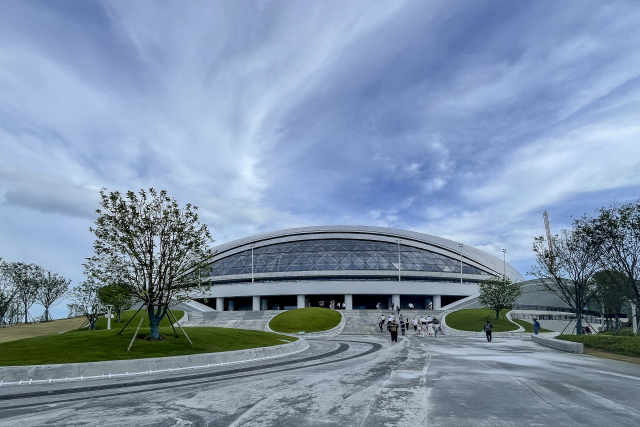 这座以“朝阳鱼跃,千岛明珠”为设计理念的主场馆,外型近似半球,像一颗浮出水面的珍珠。外部由局部膜结构和玻璃幕墙相结合,色彩柔和,融入周围的湖光山色,显得十分和谐。