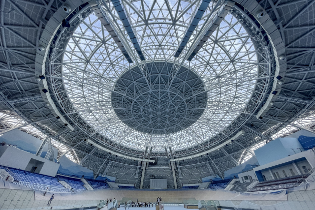 场馆最大看点是头顶的钢结构屋盖。屋盖罩棚采用国内少见的钢结构体系设计,跨度达130米,是淳安有史以来最大跨度的钢结构体系。