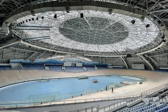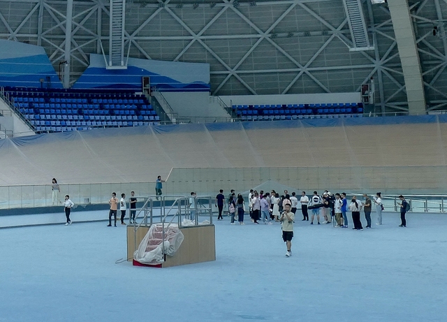 采风当天,作为赛区主场馆的场地自行车馆,已基本完工,展露初颜。