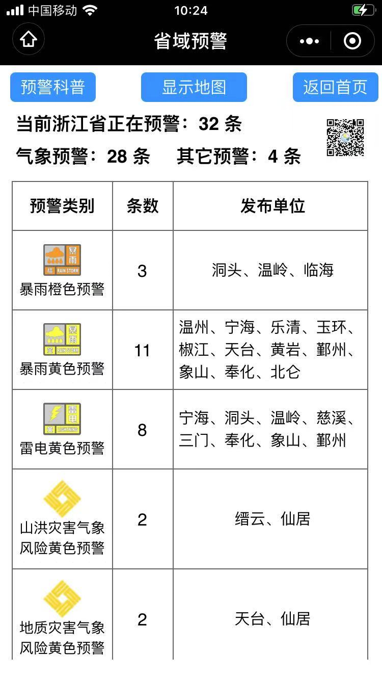 截止早上10:21,浙江省内已经有32条预警,其中28条气象预警,洞头、温岭、临海发布了橙色预警,温州、宁海、天台等11地发布了暴雨黄色预警,宁海、温岭、慈溪等8地发布了雷电黄色预警。