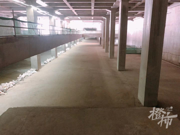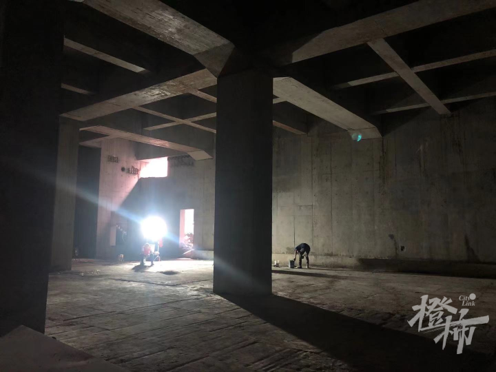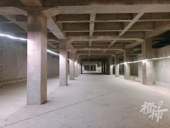 我们在现场看到,现在,连堡丰城项目不再是挖开的“大鸿沟”,下部结构施工已经完成,全部覆土。在我们探营的地下一层,放眼望去,连堡丰城的地下空间非常空旷,只有个别工人还在做一些细节的收尾工作。