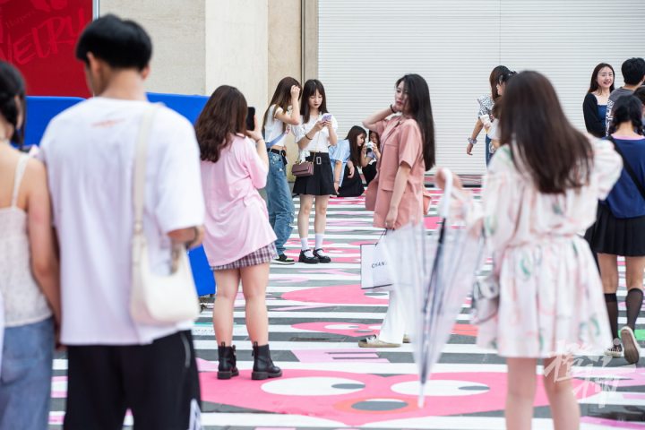 附近一家商场的工作人员说,这条斑马线是这两天新画的,配合商场的“七夕”活动。“其实是贴纸 ,直接贴上去的,前天贴了一半,昨天又贴完另一半,今天才开始有人来拍,周末肯定会更多。”