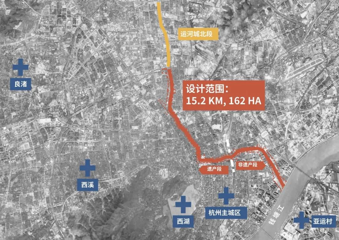 本次工程范围南起钱塘江与运河交汇处,北至石祥路,全长15.2公里。整体形成北段“延续历史的遗产段”(文晖桥至石祥路)、与南段“面向未来的非遗产段”(文晖桥至钱塘江)的规划结构。