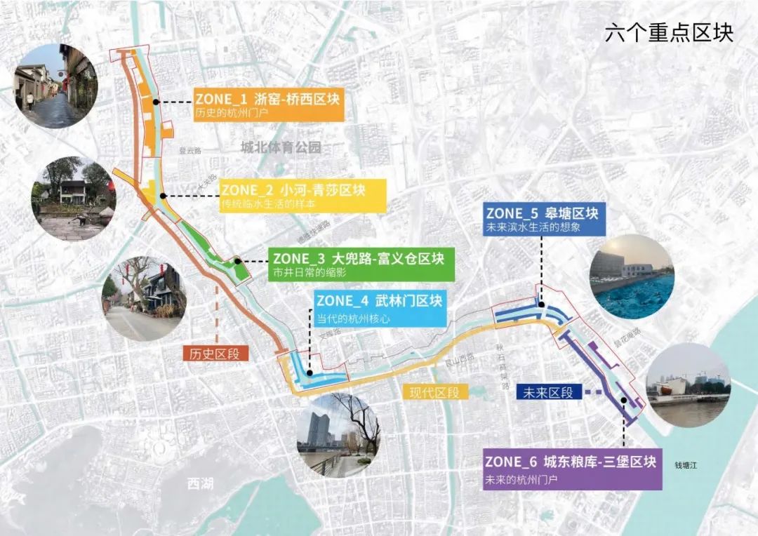重要节点共6处:浙窑—桥西区块,小河直街—青莎公园区块,富义仓—大兜路区块,武林门区块,皋塘区块,城东粮库—三堡船闸区块。