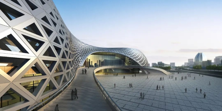 金沙湖大剧院地处钱塘区金沙湖畔,项目建筑风格、形态、色彩新颖别致,宛如柔软的绸缎,向市民传达着文化与艺术的意蕴。该项目总建筑面积约4.4万平方米,主要分为2个功能区块,1400座剧院厅和500座的多功能厅两大区域之间通过共享大厅相连。