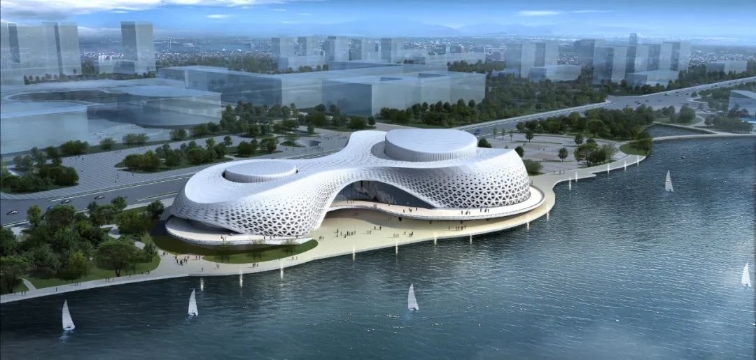 金沙湖大剧院地处钱塘区金沙湖畔,项目建筑风格、形态、色彩新颖别致,宛如柔软的绸缎,向市民传达着文化与艺术的意蕴。该项目总建筑面积约4.4万平方米,主要分为2个功能区块,1400座剧院厅和500座的多功能厅两大区域之间通过共享大厅相连。