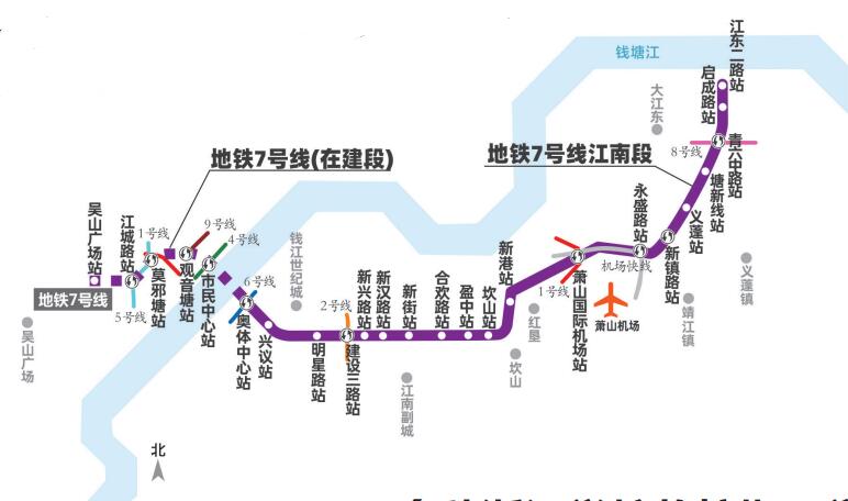 地铁7号线全长47.48公里,主体位于萧山区内,西起上城区吴山广场,向东走向与机场高速平行直至萧山国际机场,后向北直到钱塘区,设有24个站点。