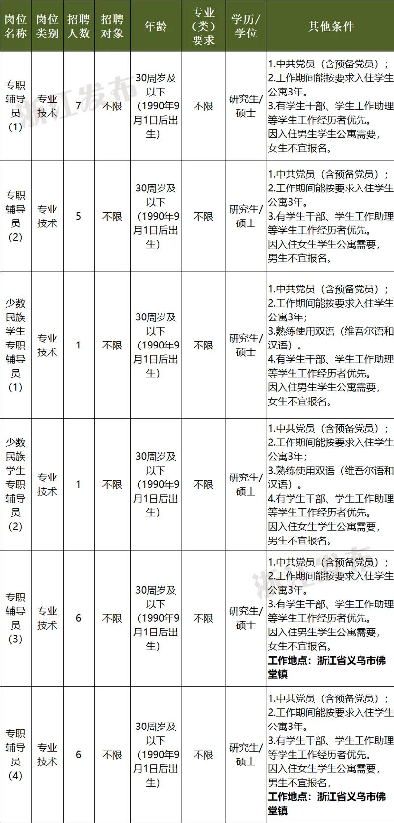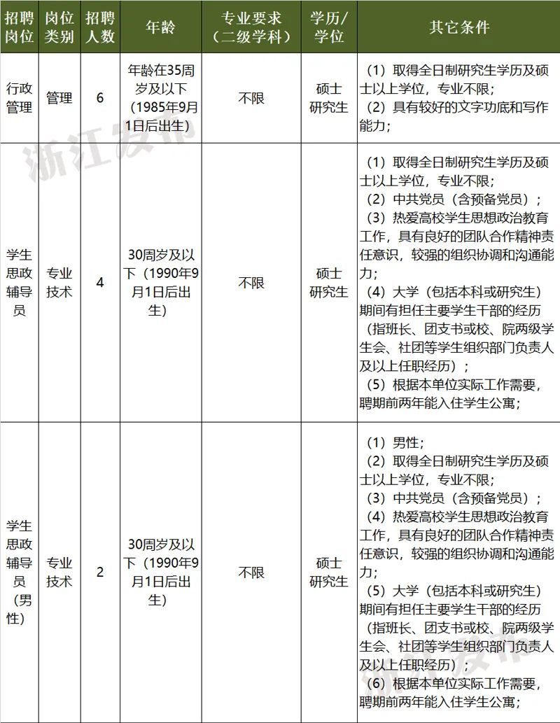 中国计量大学为浙江省属本科高校,公益二类事业单位,预算方式为财政适当补助。本次公开招聘6个岗位共26人,辅导员岗位因工作期间入住学生公寓和管理服务便利需要,根据性别按一定比例分别招聘。