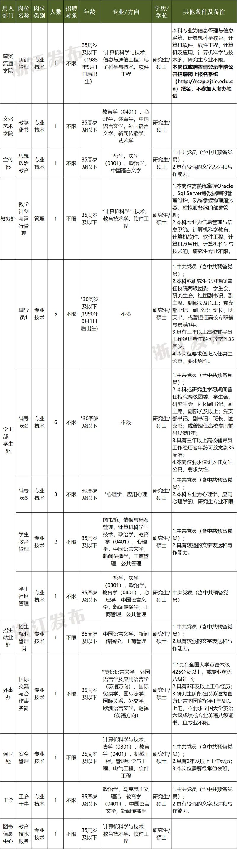 浙江经贸职业技术学院是由浙江省供销社举办的以商贸流通类专业为主体的全日制公办高职学院,是浙江省高职优质暨重点校建设单位。公益二类事业单位,预算形式为财政适当补助。学校位于杭州下沙高教园区。本次招聘需求为13个岗位共16人。