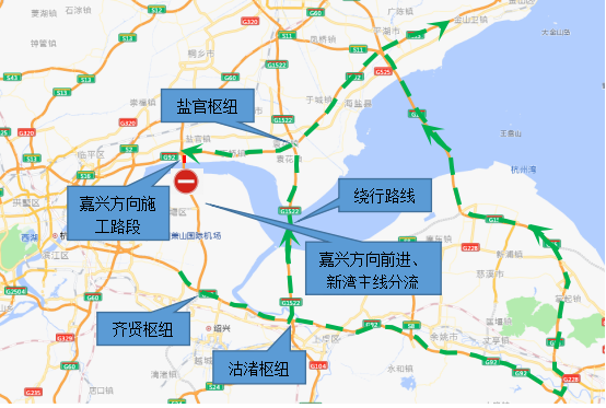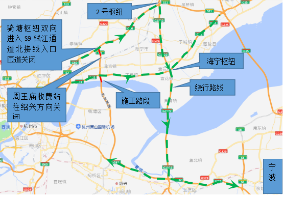 ④杭浦高速盐官西枢纽双向进入S9钱江通道北接线入口匝道关闭。错过过江路线的车辆可选择在就近的收费站掉头,从嘉绍大桥过江。