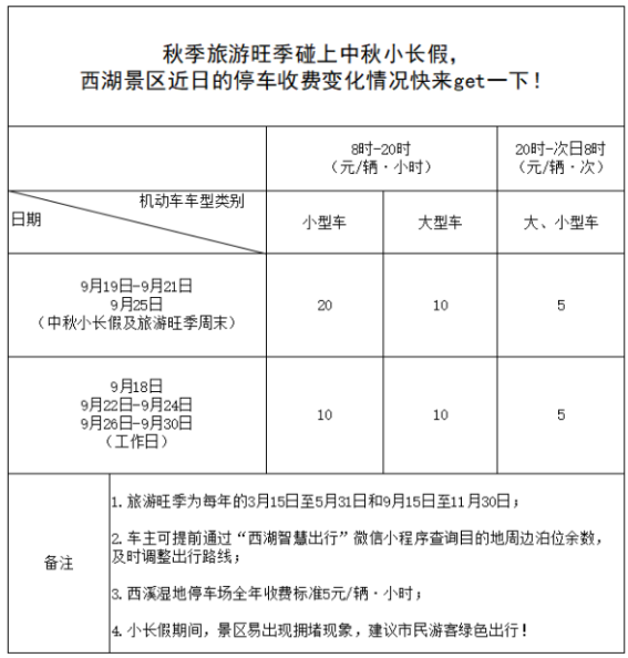西湖景区秋季旅游旺季(9月15日至11月30日)日前已正式开启,恰逢中秋小长假来临,景区的停车收费价格有变化。
