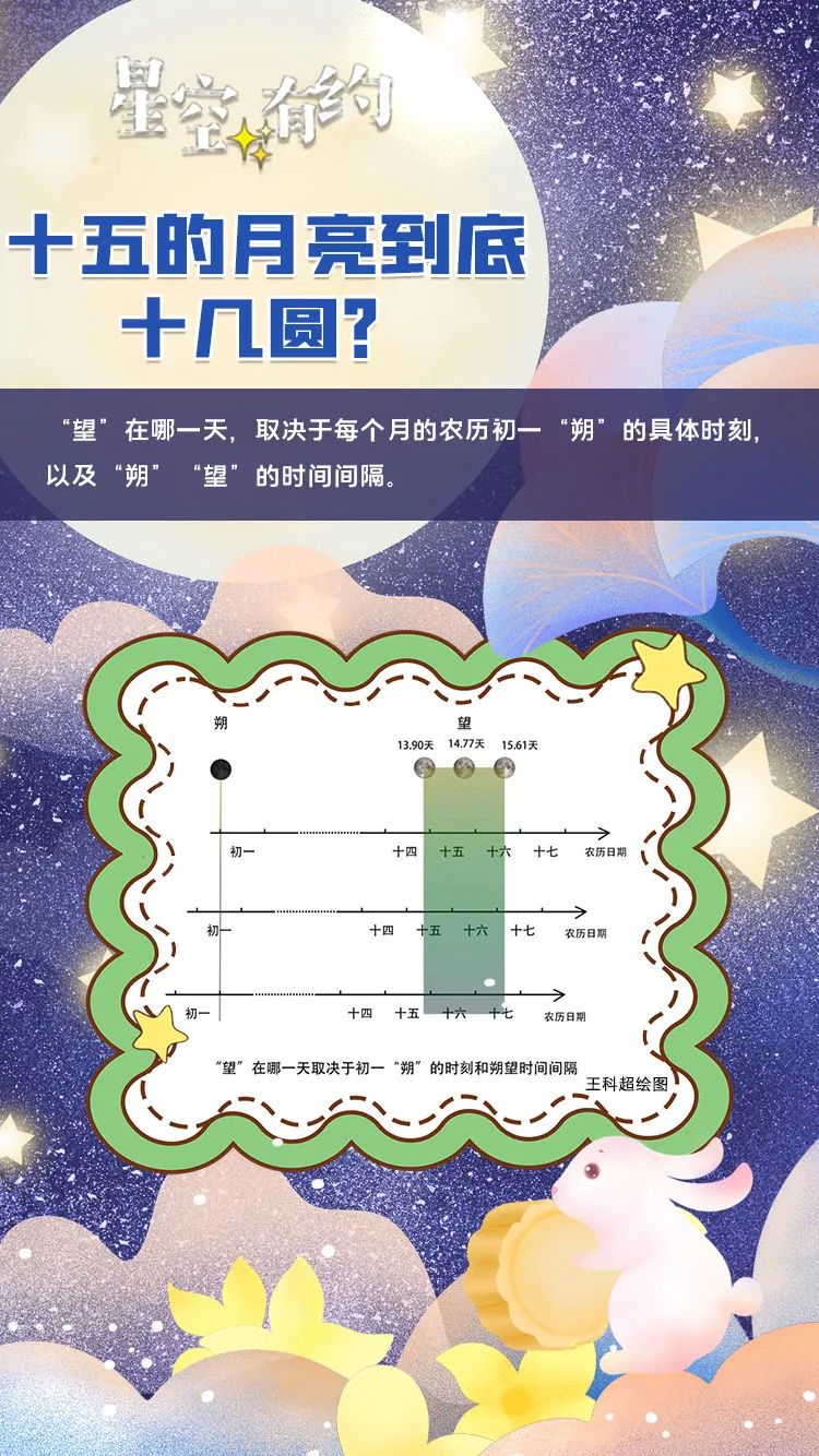王科超举例说,如果某农历月里,朔望间隔比较长,如15.1天,同时该月的朔发生在朔日接近日末的时刻,该月的望就在农历十七。反之,若某农历月中朔望间隔较短,如13.95天,同时该月的朔极其接近朔日日首,则该月的望就在农历十四,出现“十五的月亮十四圆”这一较为罕见的情况。