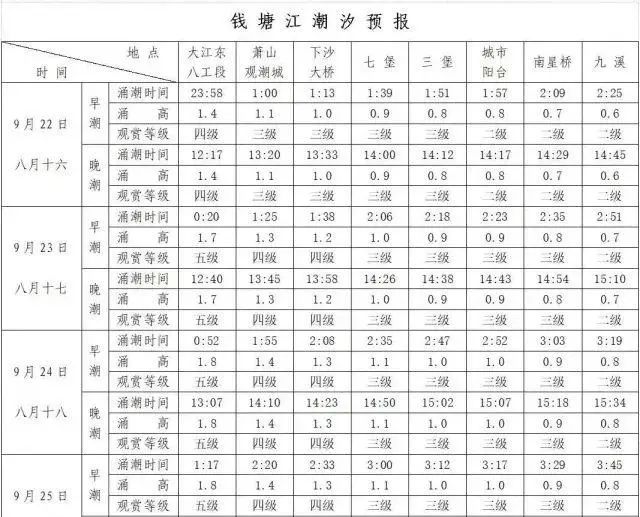 哪里能观潮?这是大家比较关心的问题。下表是杭州市水文水资源监测中心提供的八月十八期间中长期潮汐预报表: