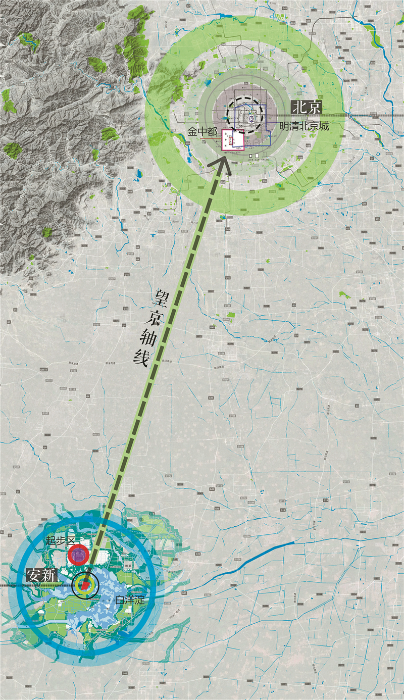 “按照传统的营城习惯,城址一般都是‘正南正北’建设,但安新古城的轴线则稍稍向当时金朝国都金中都(北京)的方向倾斜。”凭借职业敏感,华芳和团队对安新和北京的空间关系进行了分析,发现在两地之间确有一条若隐若现的“望京轴线”。“我们将古城这一反映空间格局的历史轴线,延续在安新的规划中,当地管理者都非常惊喜。”