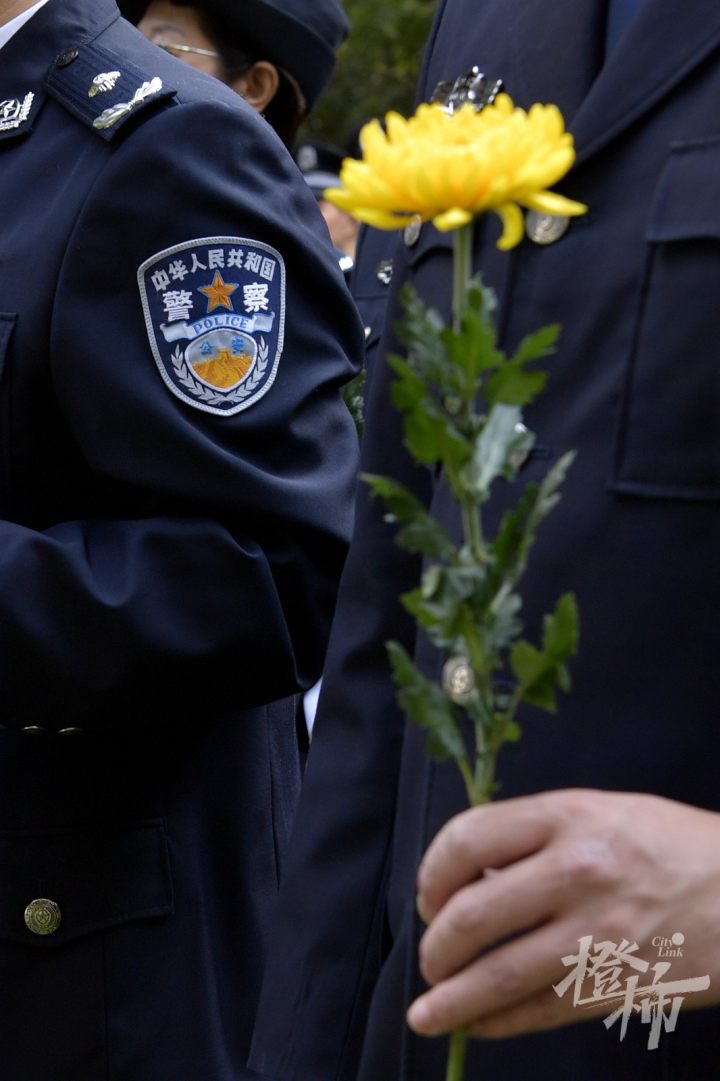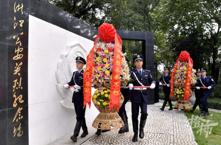 上午,杭州市云居山浙江公安英烈纪念墙前,浙江省公安厅举行向公安英烈敬献花篮仪式。