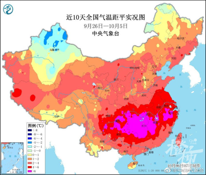 近10天的气温距平图,总体来说就是江南地区的气温比常年同期偏高6℃以上,图片来源:中央气象台