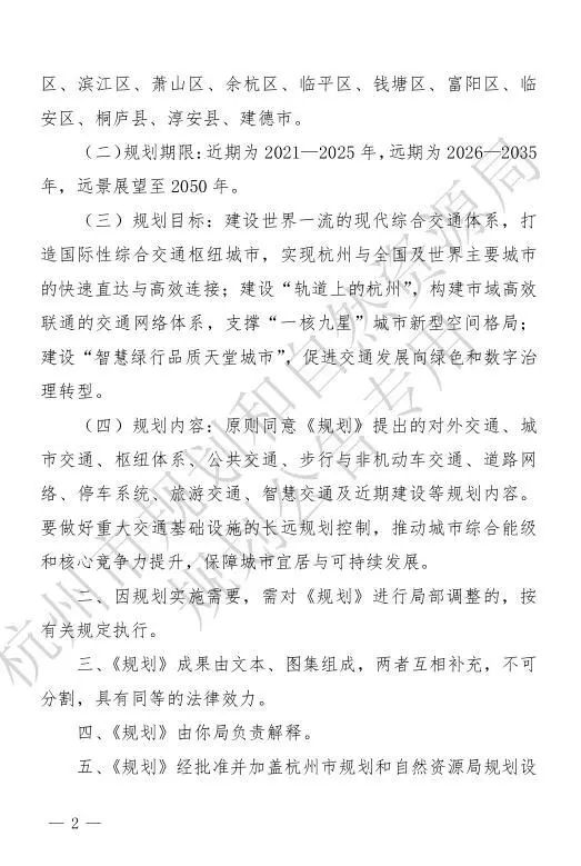 翻开获批的《规划》,分总则、交通发展战略与策略、保障措施等14部分内容,规划范围涵盖杭州全市域,近期规划至2021—2025年,远期为2026—2035年,远景展望至2050年。针对我市对外交通、城市交通、枢纽体系、公共交通、步行与非机动车交通、道路网络、停车系统、旅游交通、智慧交通及近期建设等重要方面均有具体表述。