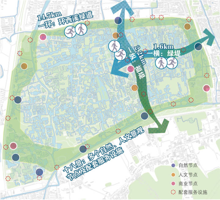 该项目以湿地肌理为本底、以西溪自然人文景观为线索、以市民健身为功能,大力倡导开放融合、多元链接、智慧服务、全民共享的城市公共绿色基础设施,构建“一横一纵一环十八景”的绚丽卷轴,力求建设“把西溪还给市民,让市民享受西溪”的人民公园。