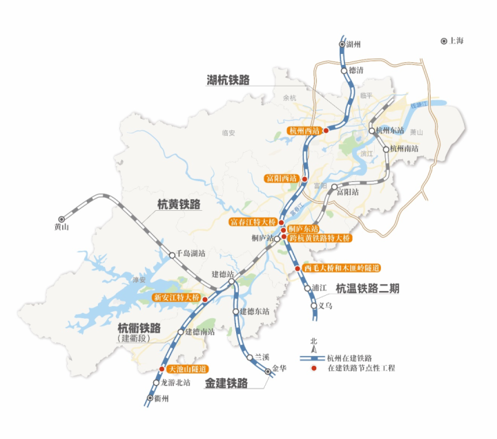 “十四五”期间,杭州将建成湖杭铁路及西站枢纽、杭衢铁路建德至衢州段、杭温铁路杭州至义乌段、金建铁路等铁路项目,新架起数条高速铁路。