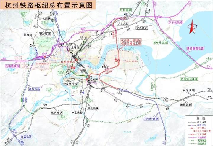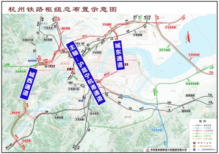 2017年,新一轮杭州铁路枢纽规划获省政府和原中国铁路总公司联合批复,确定杭州铁路枢纽布局为“一轴两翼双十字六客站”,即在现有中轴基础上,增加城西和江东两翼通道。