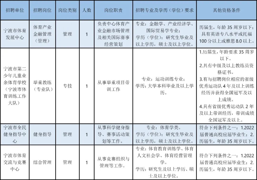 根据《宁波市事业单位公开招聘工作人员实施办法》有关规定,经市人力资源和社会保障局同意,宁波市体育局所属事业单位决定面向全国公开招聘事业编制工作人员4名。