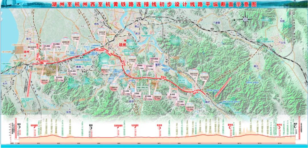 湖杭铁路全线长137.8公里,双线高速铁路,设计速度350km/h。全线桥梁50座81.8公里,隧道33座41.4公里;全线车站设湖州(接轨站)、德清、杭州西、富阳西、桐庐东、桐庐(接轨站)等6个车站,项目估算374亿元。湖杭铁路项目的建设,对于提升以省为主高铁建设技术力量和行业地位,填补我省高铁建设领域的空白具有重要意义。