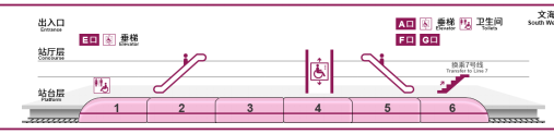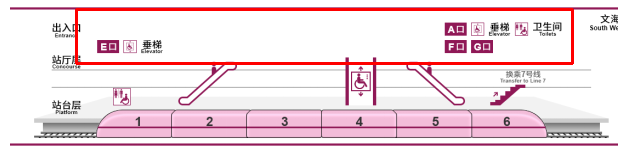 同时,该站配有2座电扶梯,入口分别分布于1车厢与2车厢连接处、5车厢与6车厢连接处。垂梯则位于4车厢中部车门附近。