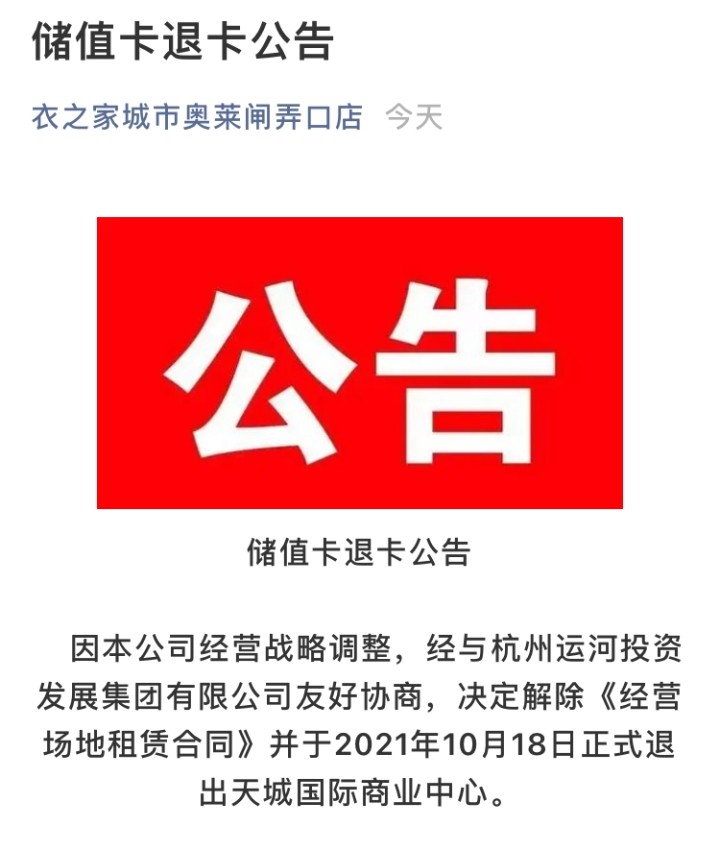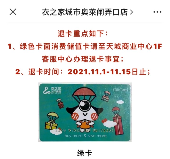 商家保持不变,但对消费者而言,还是有些变化。如果你手里还有仅限这家衣之家使用的绿色储值卡(正面是绿色),赶紧去退卡退费。退卡地址就在商场一楼的客服中心,退卡时间是2021年11月1-15日。