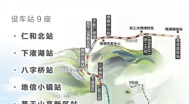 杭州至德清市域(郊)铁路工程起自余杭区仁和北站,终于德清高铁站,线路全长25.6公里。设车站9座,为仁和北站、下渚湖站、八字桥站、地信小镇站、莫干山高新区站、千秋广场站、体育中心站、浙工大站、德清高铁站,平均站间距3.15公里。项目采用市域A型车,最高运行速度120公里/小时,初、近、远期车辆编组分别为4/4/6辆。