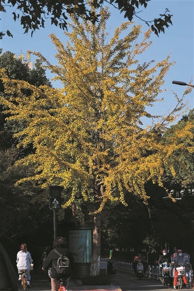 环城北路的一棵银杏已经变黄。