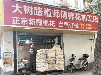 杭州的一些老小区里,至今还藏着不少弹棉花店。我家附近就有一家开了好多年的童师傅棉花加工店,每次去菜场买菜路过大树路,都能看到他。虽然一年四季都开着店门,但天气一冷,就能明显发现店门口的棉被要多叠几层……