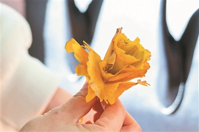 朝晖的银杏林也开始变黄了,阳光下,一个女孩用银杏落叶做了一朵花。记者 夏阳 摄