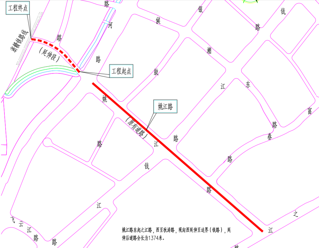 原路东起之江路750号(预编),西至秋涛路,现向西延伸至浙赣铁路线。全路长1374米,宽18米。