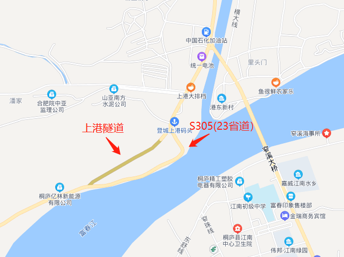 上港隧道位于杭州桐庐县与富阳区交界处,为S305(23省道)改建工程的重要组成部分,项目起点位于富阳区渌渚镇山亚村,终点位于桐庐县桐君街道梅蓉村。