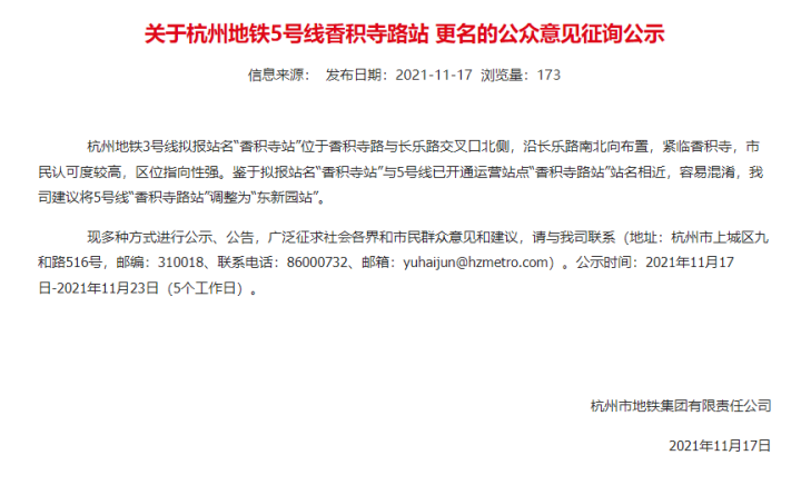 关于杭州地铁5号线香积寺路站 更名的公众意见征询公示