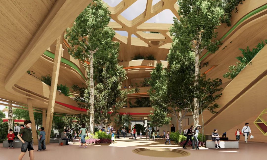 教室结合走廊功能的开发,形成跨班级的互动交流区,以“人流+信息流”为设计理念,结合绿化,使空间利用最大化。为给孩子们提供更多的趣味活动空间,设计充分利用屋顶空间,打造阳光房、未来科技农场及以运动场等等,可以让孩子们自由的探索和创意使用。