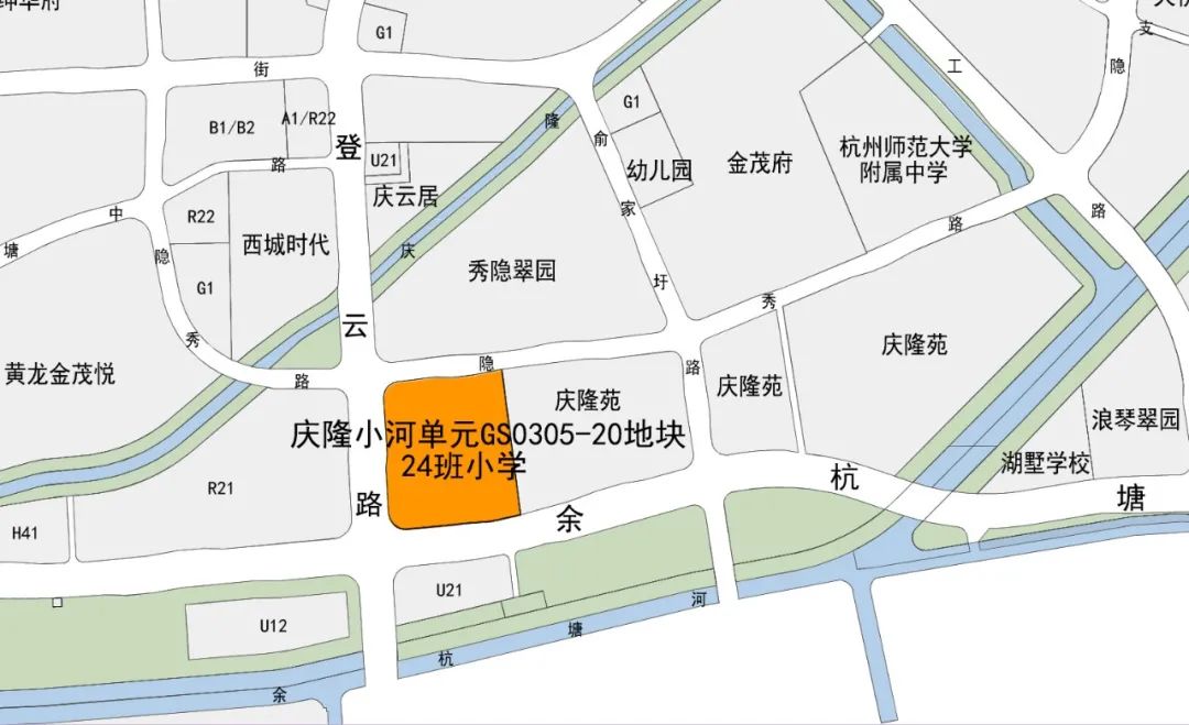 庆隆小河单元GS0305-20地块24 班小学,位于拱墅区庆隆小河单元内,西至登云路,南至余杭塘路,东至城市支路,北至隐秀路。总用地面积约22786平方米,总建筑面积为38865平方米,其中地上建筑面积22786平方米,架空层面积为594平方米,地下建筑面积15485平方米。