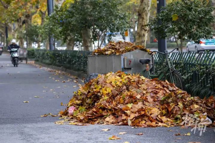 在曙光路上的一个临时落叶对方点,西湖区环境集团的工作人员正在收集不断运来的落叶。