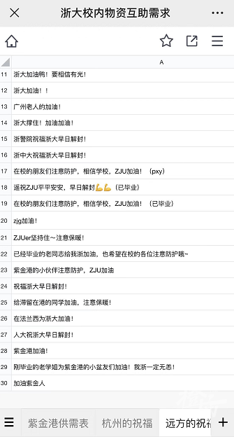 “可以提供口罩、小零食、手机充电器”“毕业校友为母校加油!希望大家注意防护”短短几分钟,上百条互助信息、一句句暖心的加油,在共享文档中呈现。