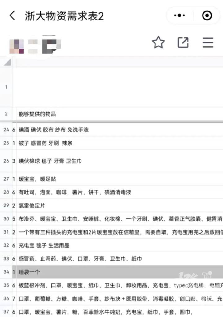 表格中的学生来自紫金港校区各学生宿舍区:蓝田、碧峰、紫云……清单上同学们列举的物品从洗衣液、口罩到酒精喷雾,再到充电宝和毛毯,还有寒夜里的外套、小零食、暖宝宝……一应俱全。“共克时艰,为浙大加油”的声音,一时间也刷满屏幕。