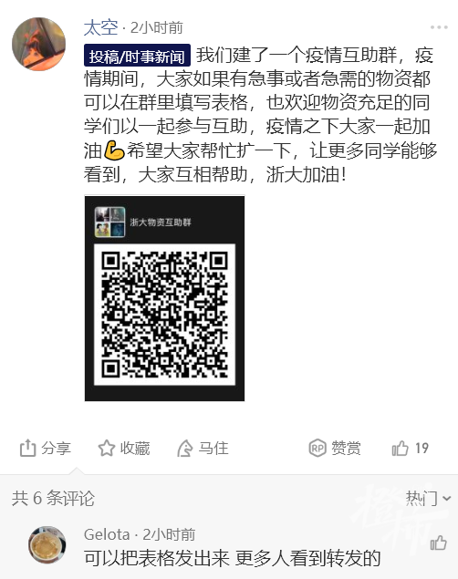 晚上七点多,两人一起建起了互助微信群,一份共享互助文档也同时建立了起来,方便有物资需求的同学在群里及时沟通。八点,他们并把群二维码投放到了校园公众平台上。“一开始只有零星的十几个人进了群,到了八点十几分的时候,群里人数突然激增,很快就到了200人的上限,所以我们又建了微信2群。”