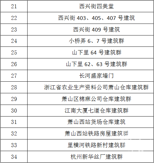 34处历史建筑中,上城区9处,拱墅区3处,西湖区5处,西湖风景名胜区3处,滨江区7处,萧山区6处,临平区1处。
