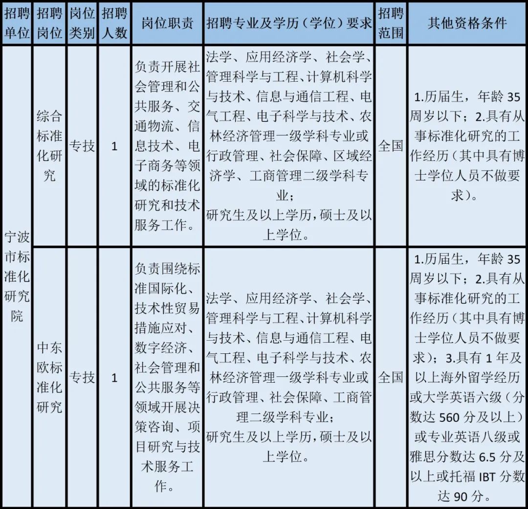 根据《宁波市事业单位公开招聘工作人员实施办法》和《宁波市市场监督管理局局属事业单位公开招聘工作人员实施细则》有关规定,经市市场监督管理局同意,宁波市标准化研究院决定面向全国公开招聘事业编制工作人员2名。