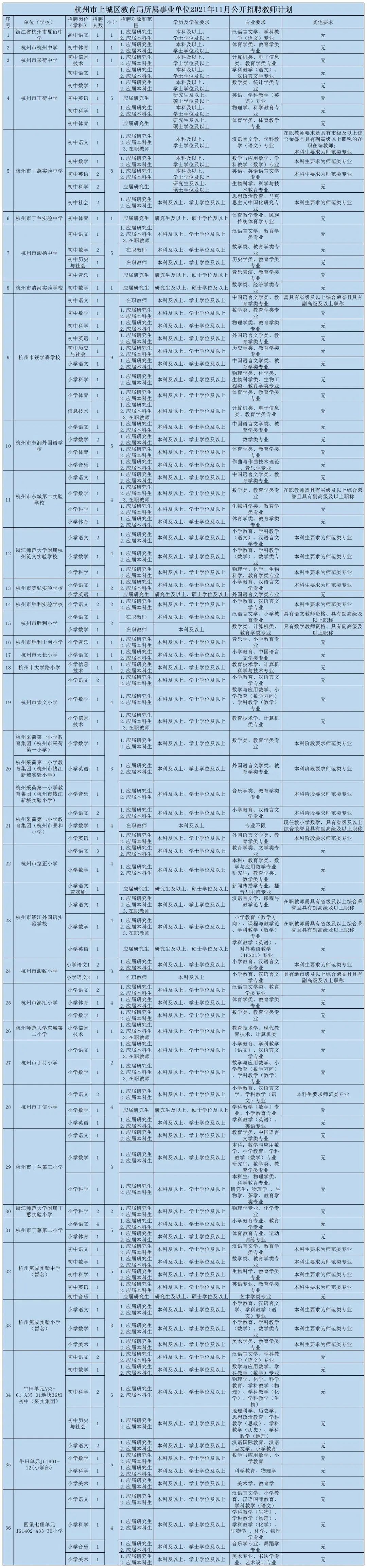 参加本次招聘的事业单位,经费形式均为财政全额拨款,参加本次招聘被聘用的人员均列入事业编制。各招聘单位、岗位、人数、条件及其他情况详见附件1《杭州市上城区教育局所属事业单位2021年11月公开招聘教师计划》(以下简称“计划”)。
