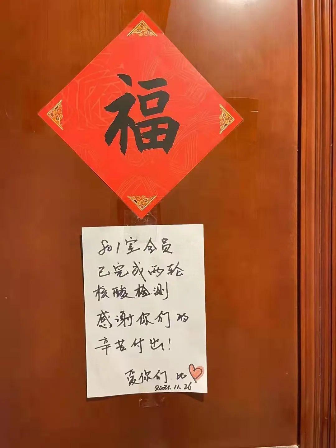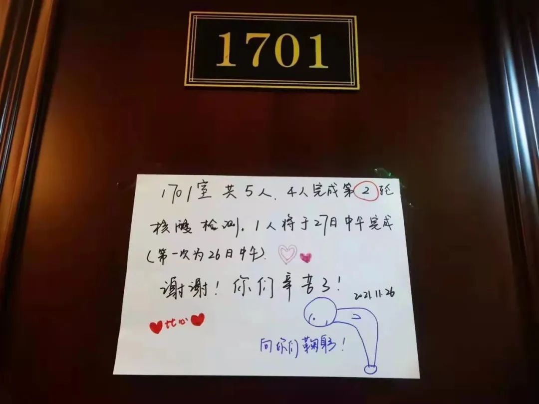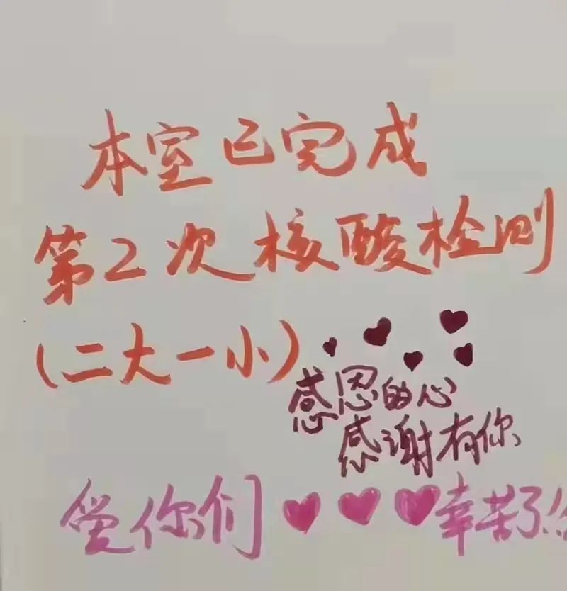 “801室全员已完成两轮核酸检测,感谢你们的辛苦付出。爱你们,比心。”