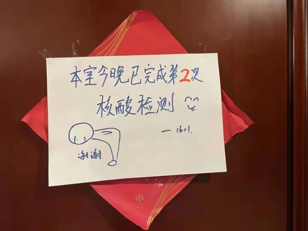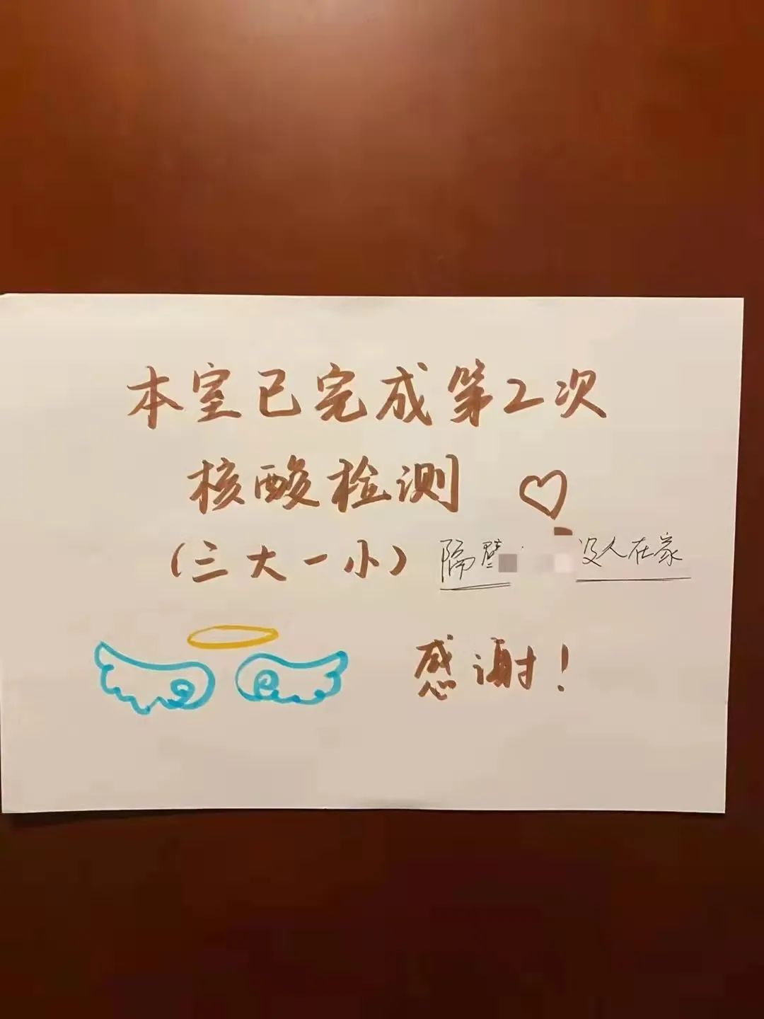 “本室已完成第2次核酸检测(三大一小),感谢!隔壁没人在家。”